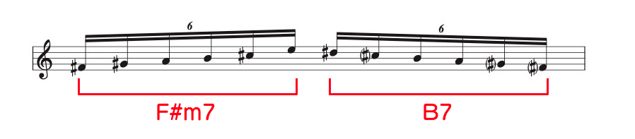 今回はこの2小節めの「F7」でのフレーズを紹介しましょう。